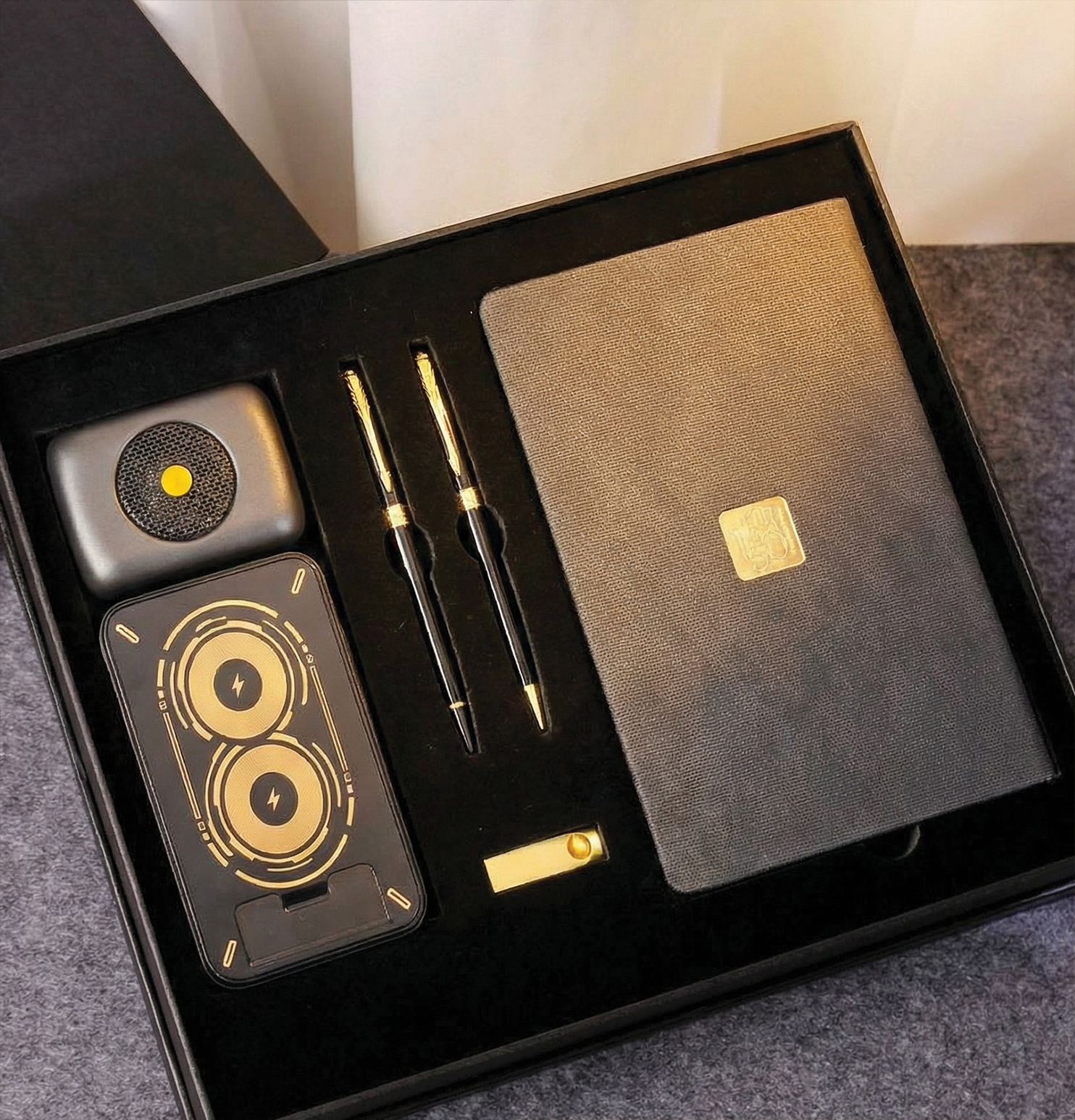 شامل : سالنامه رقعی، استند وایرلس دار موبایل به همراه اسپیکر، فلش ست خودکار و روان نویس نفیس به همراه فوم و هاردباکس